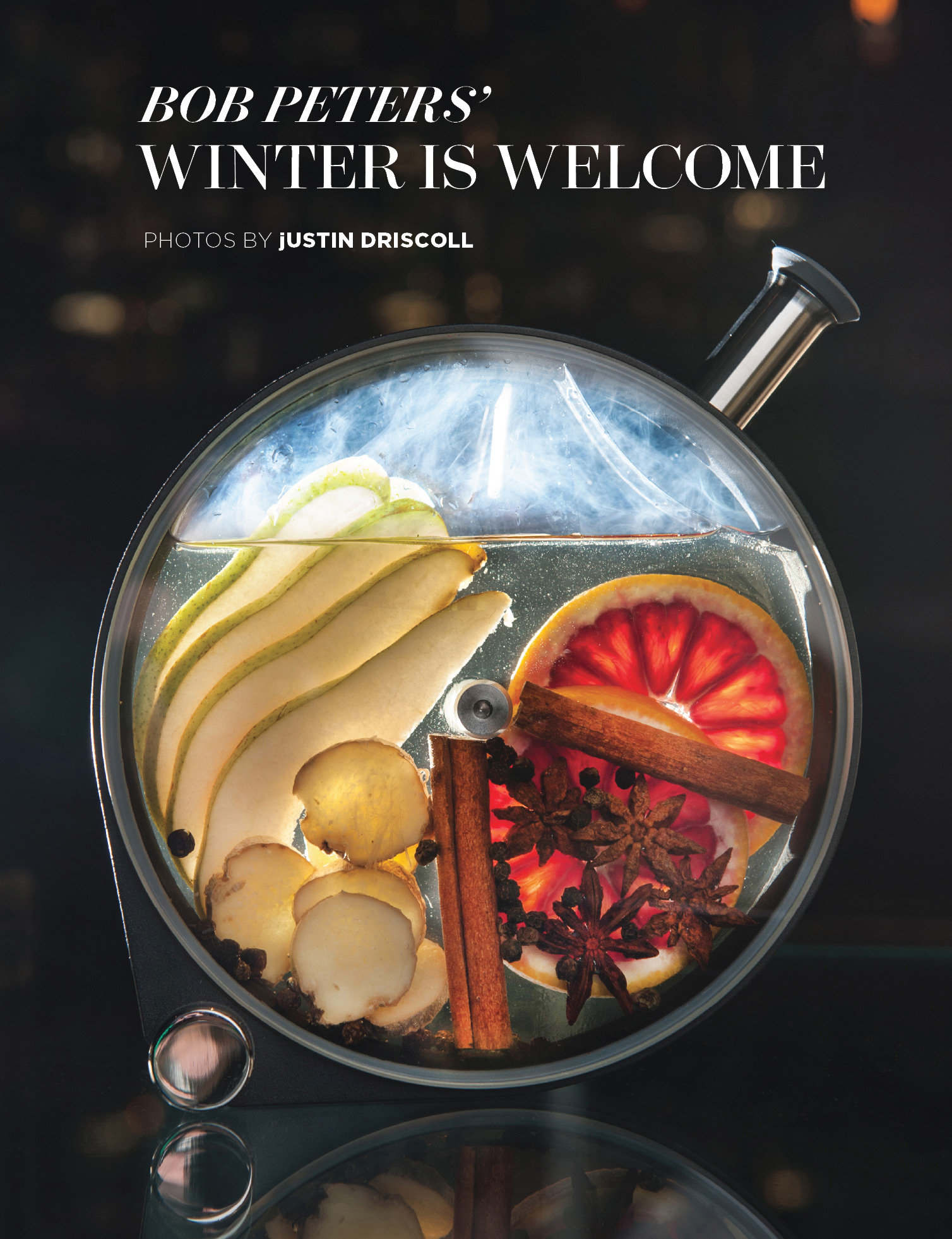 “When we told Bob Peters our first issue of 2016 was dedicated to Charlotte’s arts and culture his first reaction was to create an avant-garde cocktail that would push the limits. And push them he did. His “Winter is Welcome” recipe is nothing short of revolutionary. Using a porthole, a hand-held smoker, North Carolina pecan wood, and the perfect blend of local ingredients, Peters creates a concoction of the ethereal.”